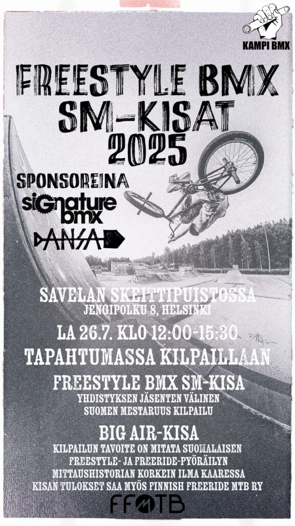 Kampi BMX järjestää 26.7.2025 klo 12:00-15:30 välisenä aikana vuotuiset epäviralliset freestyle BMX Suomen mestaruus kilpailut Savelan skeittipuistossa (kartta alla).
